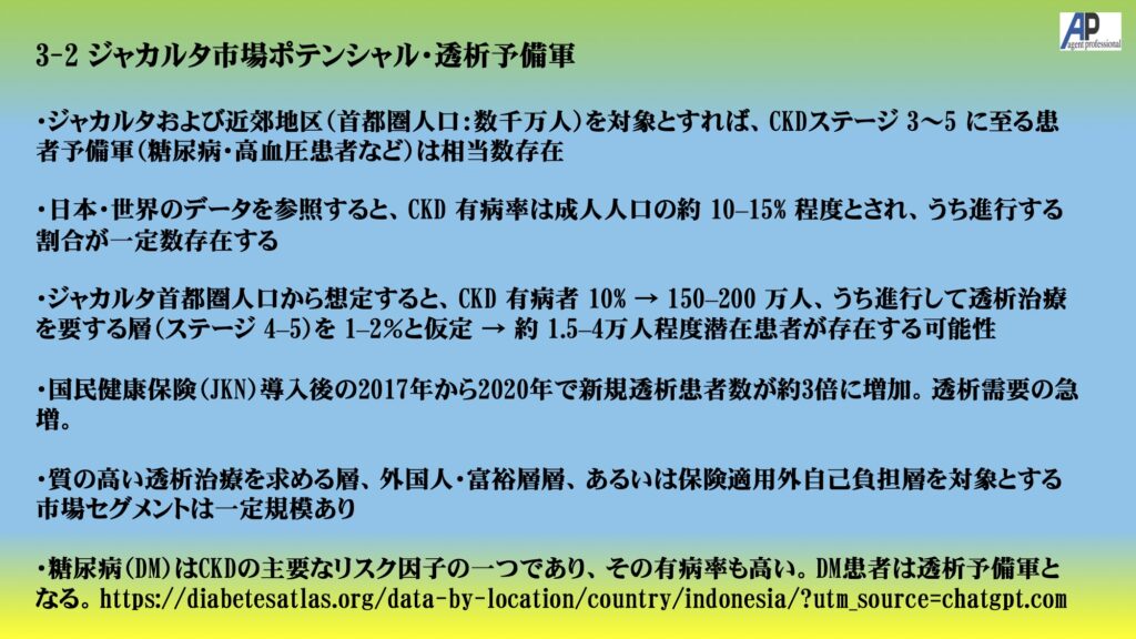 イスラム教国であるインドネシアはラマダンの後の糖分の過剰摂取により糖尿病から腎臓の機能が低下して人工透析を受けなければならなくなる方が多いです。つまり、人工透析クリニックの需要が高いと言えます。データにもありましたように今後も糖尿病や腎機能が弱い方が人工透析の患者数値は上昇傾向にあります。つまり採算性は高い事業であると言えます。そして日本とも友好な関係国であることとGDPの高さから検討するとインドネシアは海外進出にとっても透析施設開業にとってもベターな国であると考えられます。